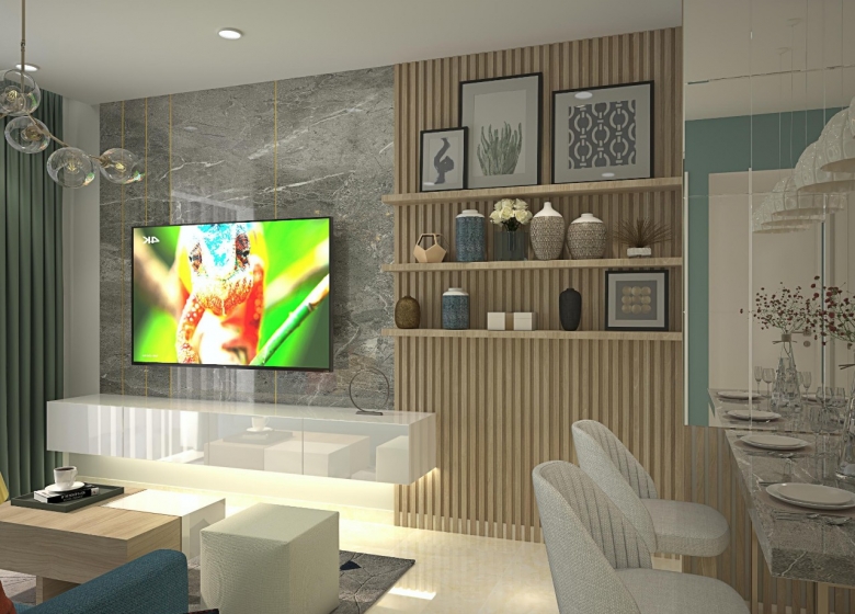 Phần tường sau tivi trong thiết kế này sử dụng đá cẩm thạch xám bóng loáng, kết hợp cùng đường viền vàng tinh tế, tạo điểm nhấn sang trọng và đẳng cấp cho không gian phòng khách. Sự kết hợp giữa các vật liệu cao cấp giúp không gian trở nên sáng sủa và tinh tế hơn, là xu hướng thiết kế phổ biến trong các căn hộ hiện đại.