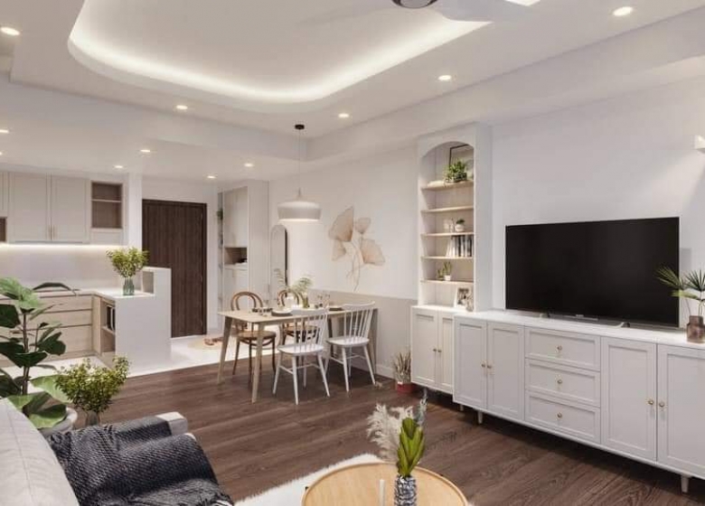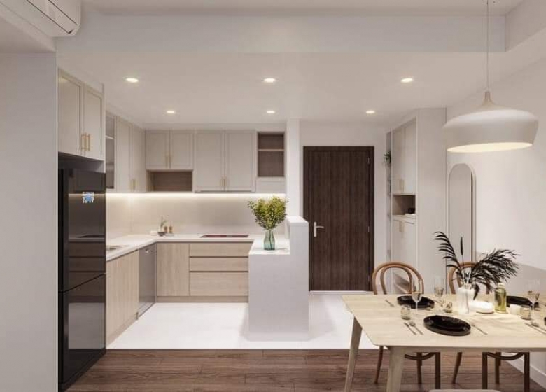 Thiết kế mở giữa phòng khách và phòng ăn tạo sự thông thoáng, rộng rãi cho không gian sống. Không gian liên thông giúp gia đình dễ dàng tương tác với nhau trong mọi sinh hoạt hàng ngày, đồng thời giúp ánh sáng tự nhiên lan tỏa khắp nhà, làm cho căn hộ luôn sáng sủa và thoáng đãng.